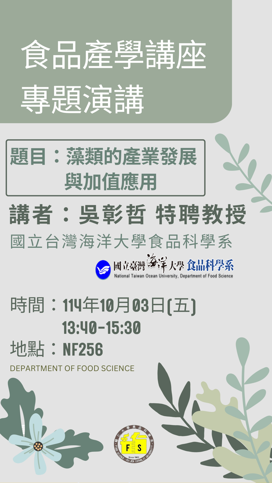 【專題演講】食品產學講座:藻類的產業發展與加值應用 (講者:吳彰哲特聘教授)- 114/10/03
