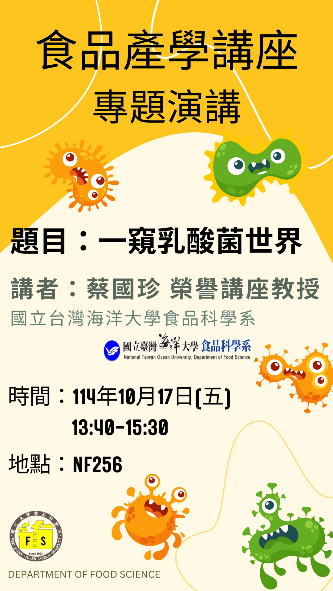 【專題演講】食品產學講座:一窺乳酸菌世界 (講者:蔡國珍 榮譽講座教授)- 114/10/17