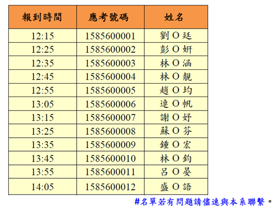 #考生名單及報到時間如下表,請務必準時報到;報到後即可進考試準備室準備考題。