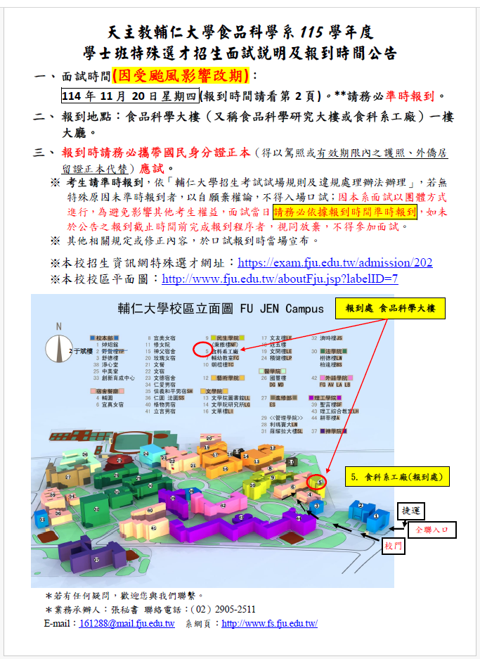 聯絡方式: 張秘書 161288@mail.fju.edu.tw 、02-29052511