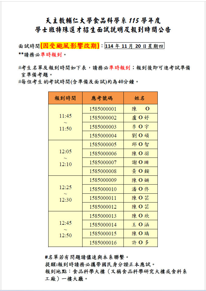 受鳳凰颱風影響,原定於114年11月13日(四)舉行之「115學年度特殊選才招生面試」,輔仁大學特殊選才面試時間統一順延至下周。