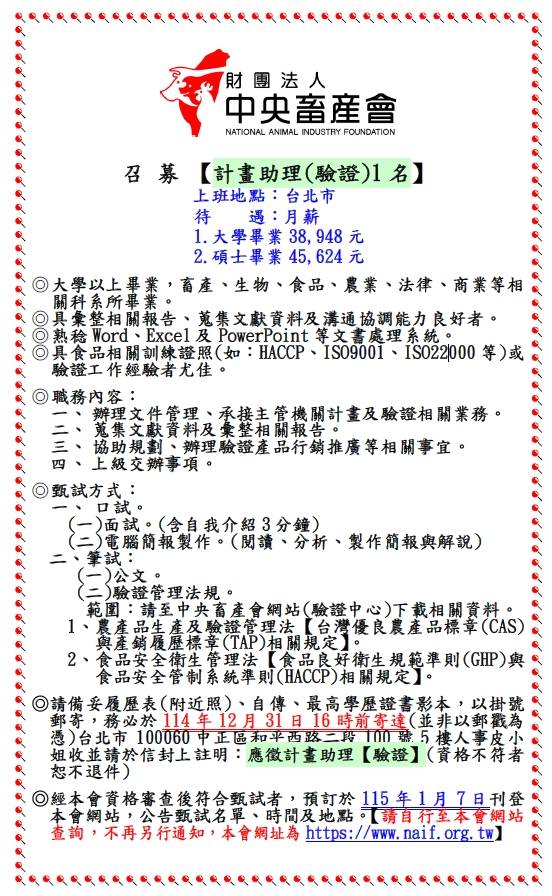 中央畜產會的徵才資訊- 1141217驗證組公開召募計畫助理1名公告.pdf