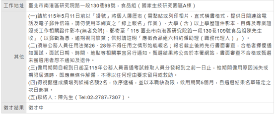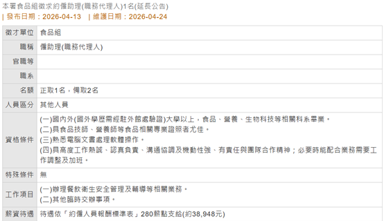 【徵才公告】食藥署食品組徵求約僱助理(職務代理人)1名(延長公告,115/5/11前)