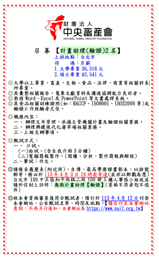 【徵才公告】中央畜產會驗證組招募計畫助理1名